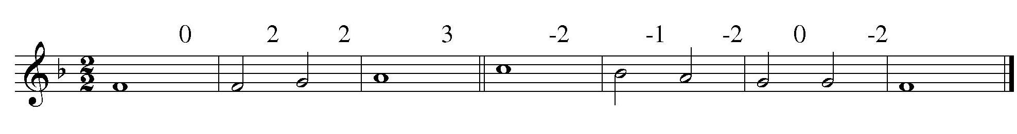 In this melodic index to the Anglican chants, chants from a number of chant books are included. The index is based on the succession of (semi-tone) intervals in the melody rather than the relative position with respect to the first note (as used in The New Saint Paul’s Cathedral chant book). This sequence is called the "fingerprint". The example below illustrates the method for an F-major Single chant. The resulting (full) fingerprint is: 0 2 2 3 -2 -1 -2 0 -2. |
